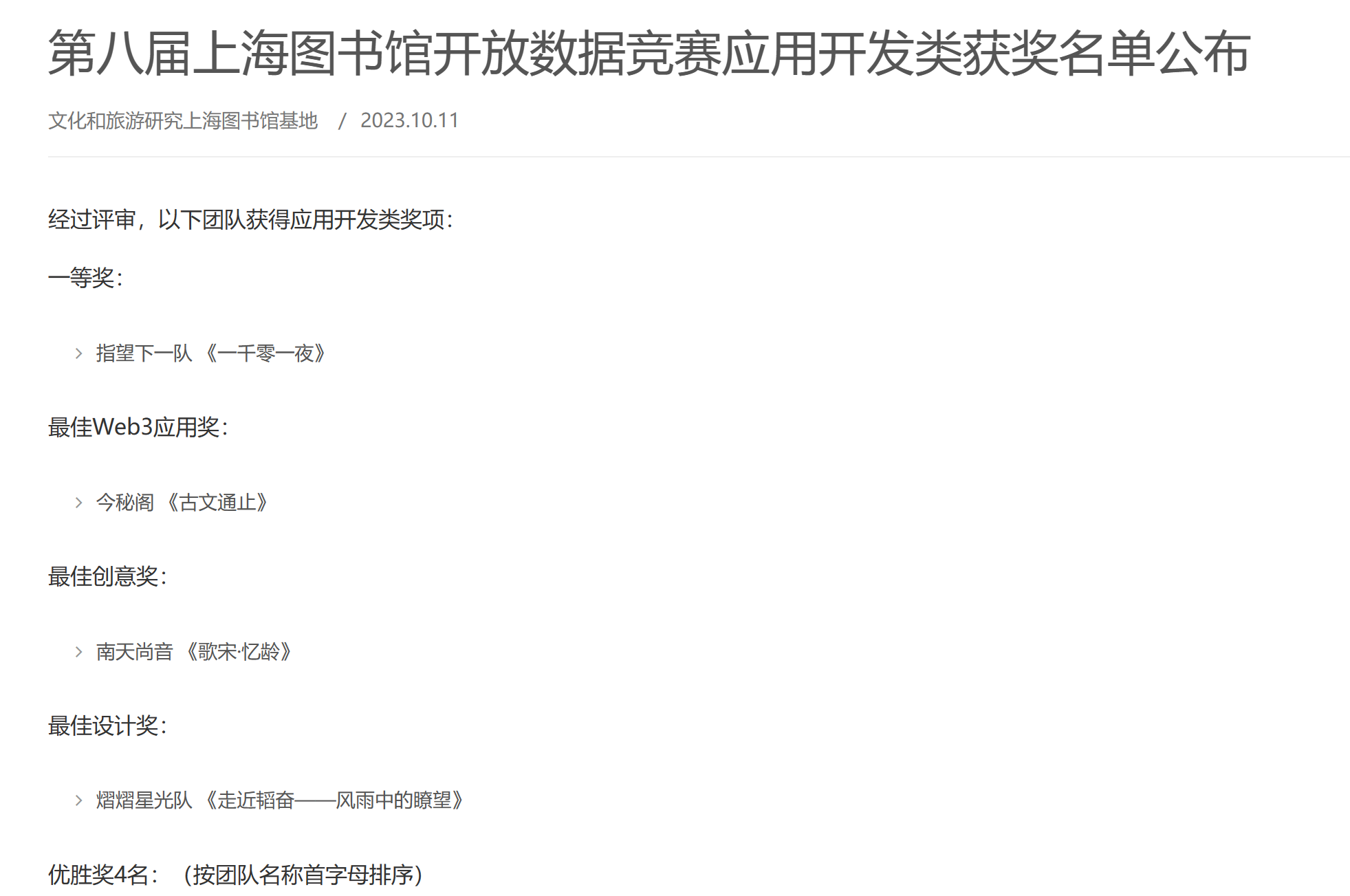 10月8日,第八届上海图书馆开放数据竞赛应用开发类决赛答辩于上海图书馆举行。此次比赛由上海市经济和信息化委员会、上海市文化和旅游局指导,由上海图书馆(上海科学技术情报研究所)、国际科学技术信息理事会(ICSTI)、上海市中心图书馆主办,与CADAL项目管理中心、中国历代人物传记资料库项目(CBDB)、复旦大学图书馆等多家单位进行合作。本届大赛以“链汇古今,AI赋人文”为主题,面向全球征集优秀移动应用原型、创意及算法。上海图书馆开放数据竞赛自2016年起已成功举办7届,被列入新葡的京集团8814信息资源管理专业竞赛名单。大赛共吸引来自28个省市、国内外的一百多支队伍参赛,参赛选手涵盖了高校员工、企业团队、政府人员。本届大赛共设有应用开发类赛道、创意论文类赛道和算法类赛道,其中应用开发类赛道设一等奖1名、最佳Web3应用奖1名、最佳创意奖1名、最佳设计奖1名和优胜奖4名。